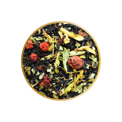 Ingrédients : thé noir Assam, Inde du Sud, feuille de mûre,arôme naturel, raisin (raisin, huile végétale), verveine entière, baie de sureau, framboise, mûre (2%), fraise, cassis, groseille.