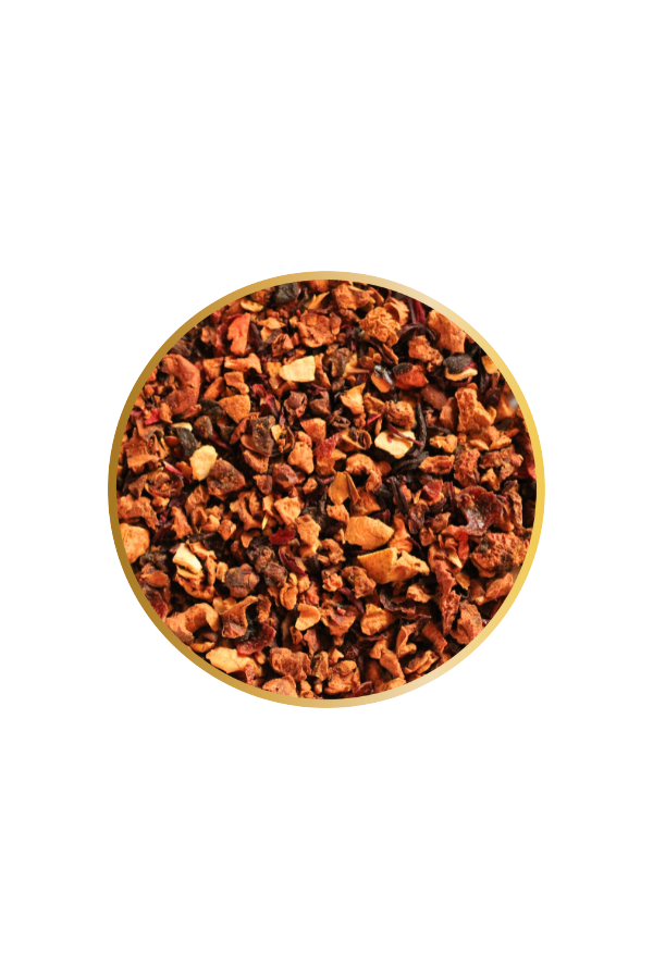 Pomme, hibiscus, cynorrhodon, écorces d'orange, racine de chicorée arôme naturel d'orange, huile essentielle de mandarine.